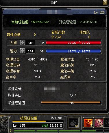125级63%单休战 七套装备 150万技能